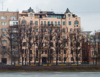 Доходный дом Вешнякова на Малой Бронной, 32 был построен в 1912-1913 годах по проекту архитектора И.Г. Кондратенко (считается одной из его лучших работ) совместно с архитектором С.А. Дорошенко в неорусском стиле, в котором сочетаются элементы северного модерна и архитектурные приемы русского средневекового зодчества.