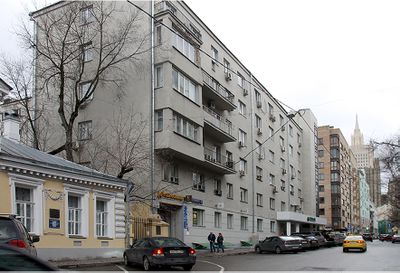 Шестиэтажный угловой дом № 29 по улице Сивцев Вражек был построен в 1929-1930 годах для начальствующего состава Народного комиссариата морского флота по проекту архитектора П.А. Голосова.