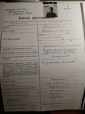 19 декабря 1937г. Викентий Эдмундович Романовский был арестован. Ему было предъявлено обвинение в том, что "он является участником шпионско-диверсионной повстанческой организации, созданной польской разведкой, по заданию которой проводил шпионско-диверсионную разрушительную работу, умышленно совершал аварии, насаждал шпионско-диверсионные кадры, вел контрреволюционную агитацию" - выписка из постановления об избрании меры пресечения и предъявлении обвинения.