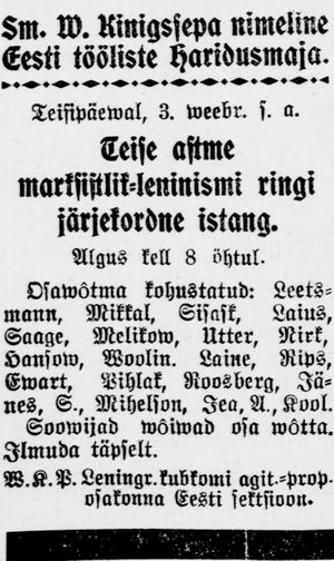 Архивы Эстонского рабочего дома просвещения им. В. Кингисеппа за этот период сохранились, но ещё не оцифрованы.