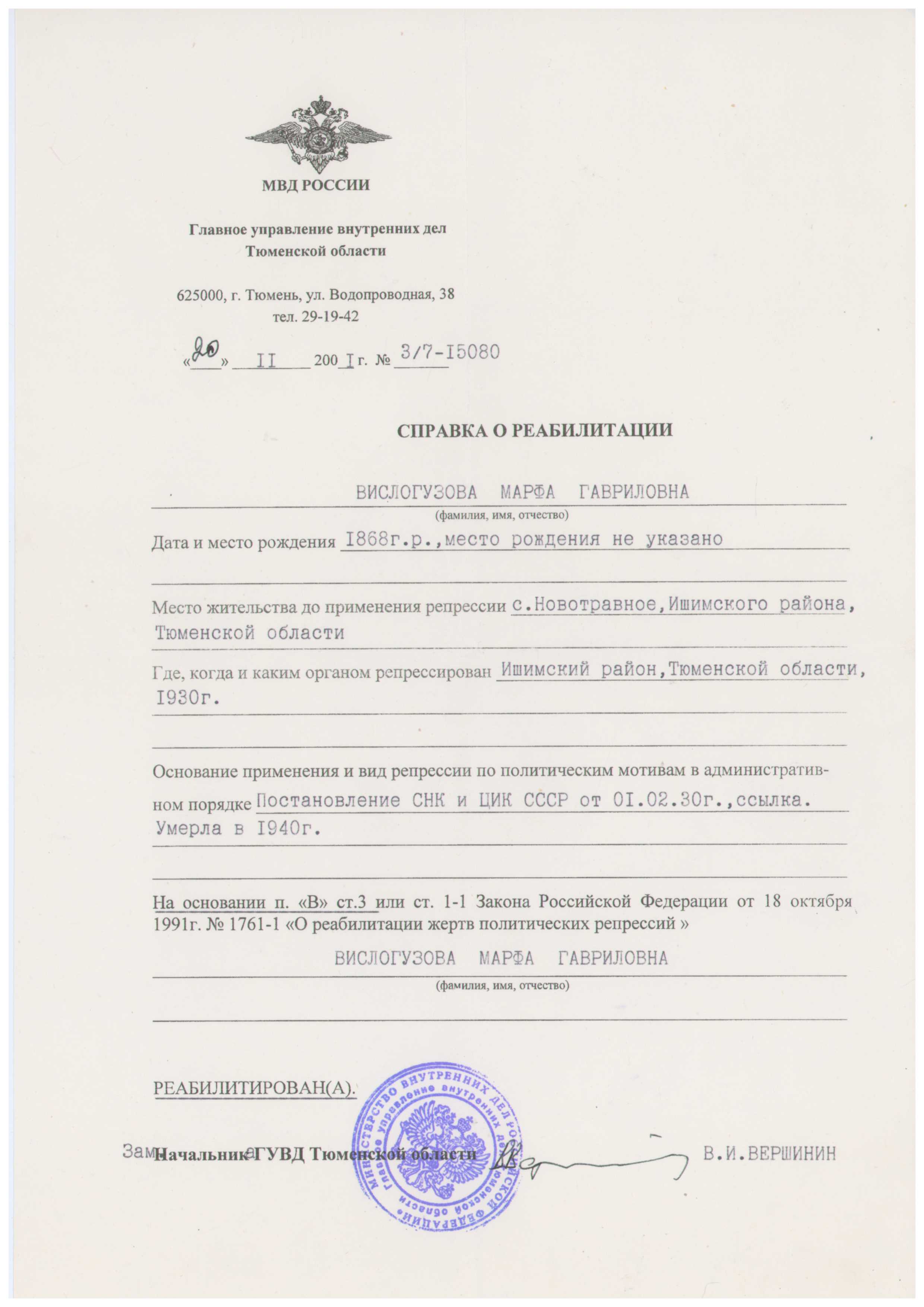 Файл:Вислогузова Марфа Гавриловна (1868) справка.jpg