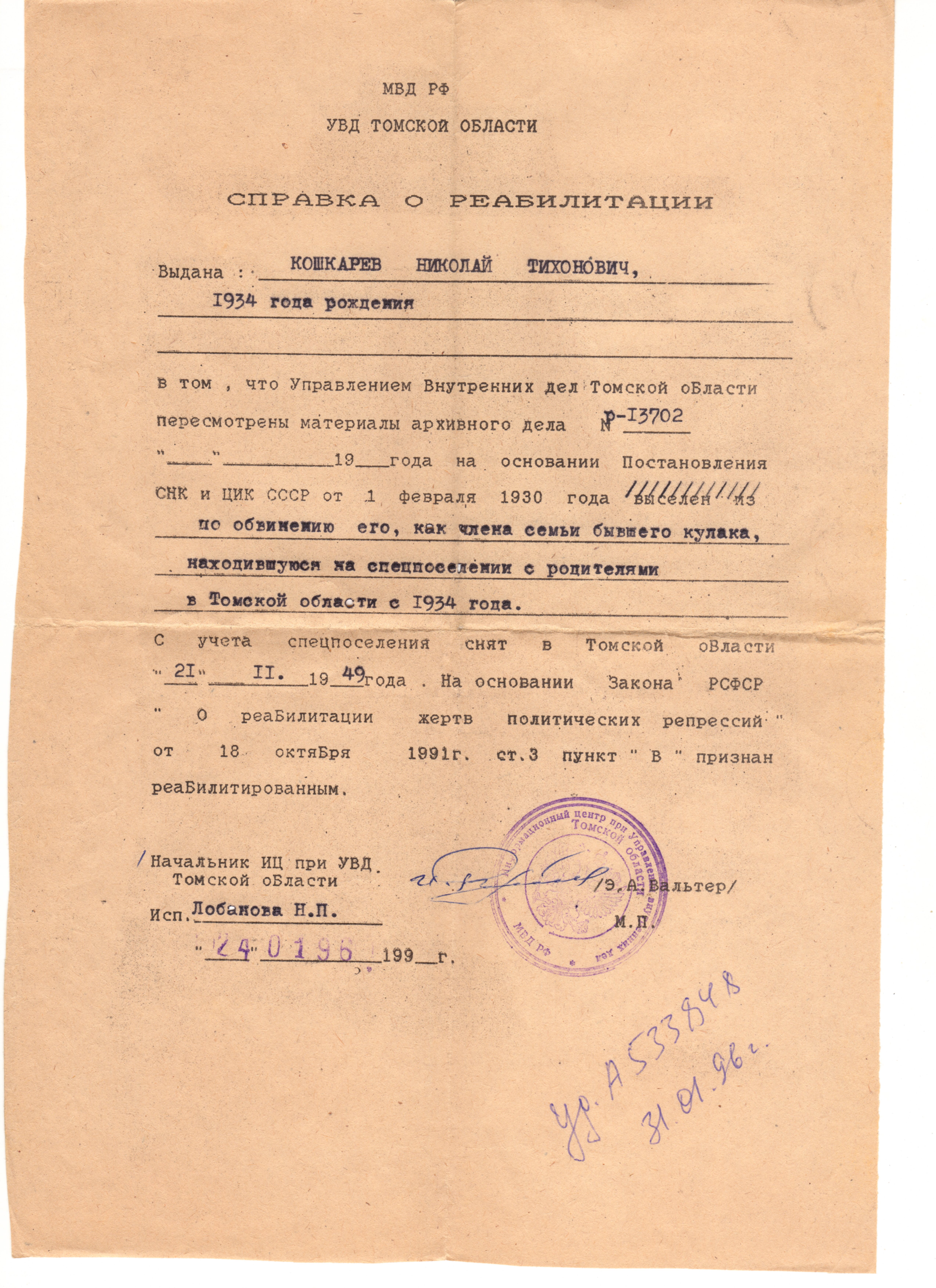 Файл:Кошкарев Николай Тихонович (1934) справка о реабилитации.jpg