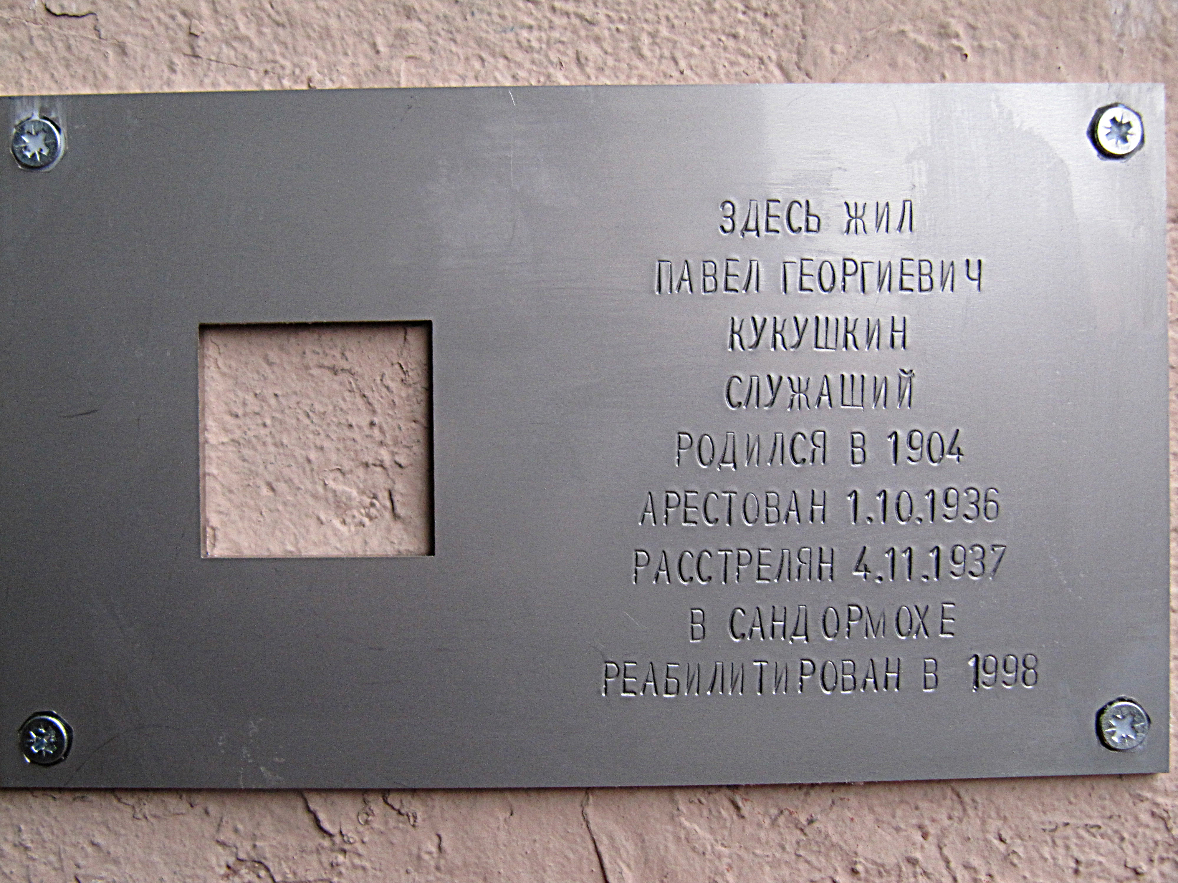 Файл:Кукушкин Павел Георгиевич Табличка Последнего адреса.JPG
