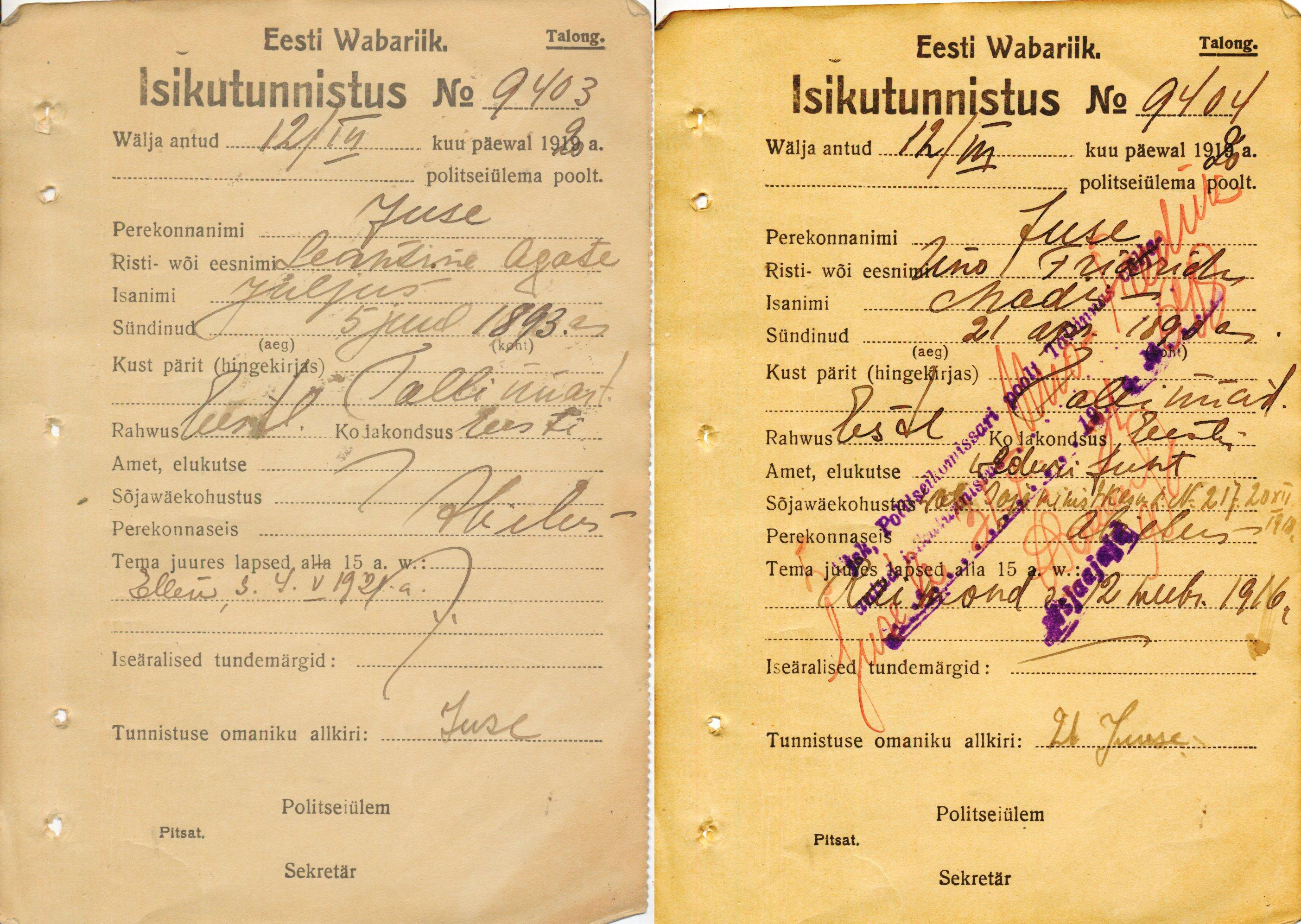 Гражданские удостоверения Леонтины и Уно Юзе от 12 марта 1920 г. В удостоверение Леонтины позднее вписана её дочь Эллен (но отсутствует запись о сыне Раймонде). Напротив, в удостоверение Уно вписан Раймонд, но Эллен так и не была вписана, хотя удостоверение аннулировано только в 1931 году