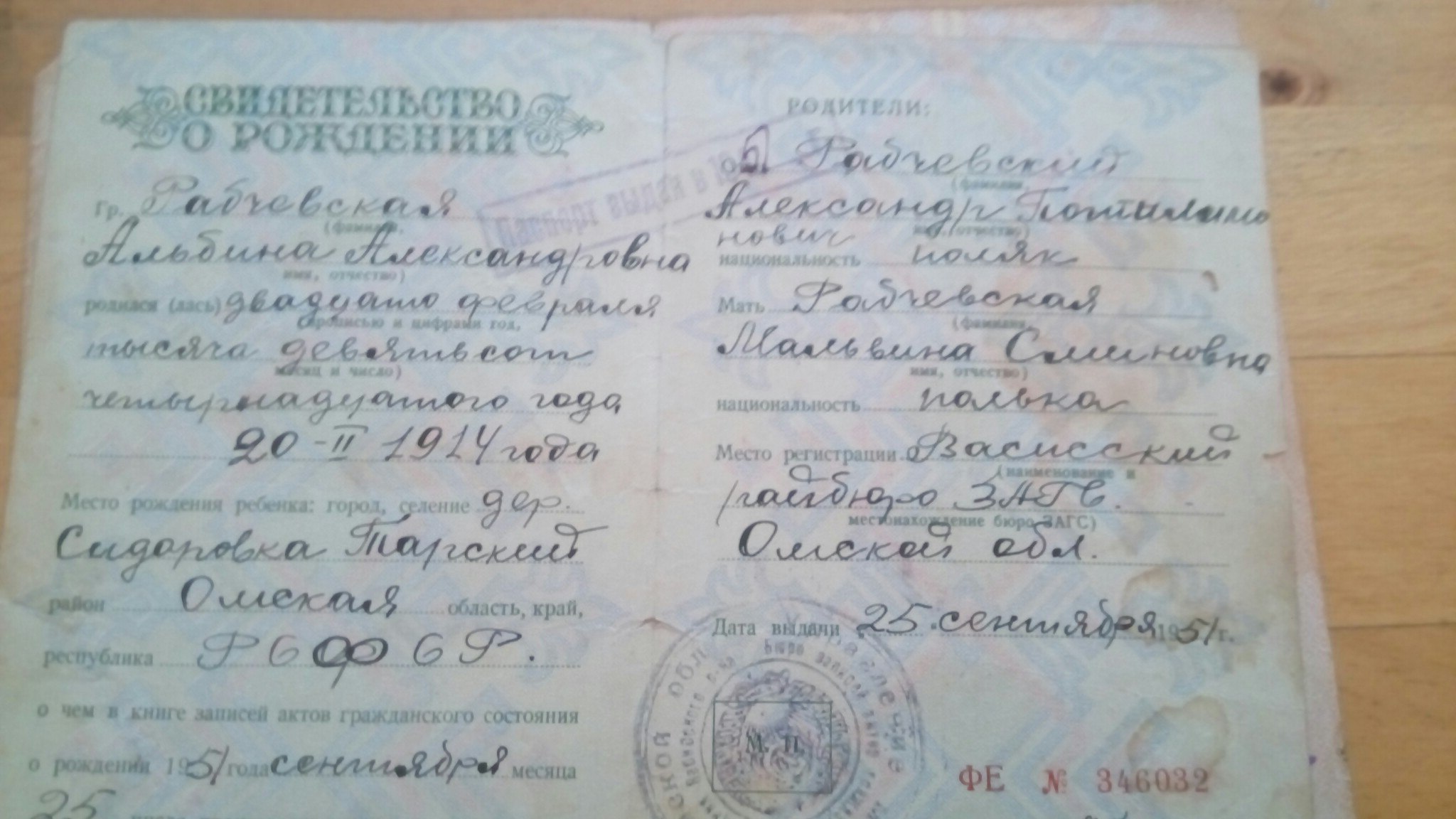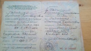 Свидетельство о рождении, дочери Рабчевского Александра Пантелеймоновича