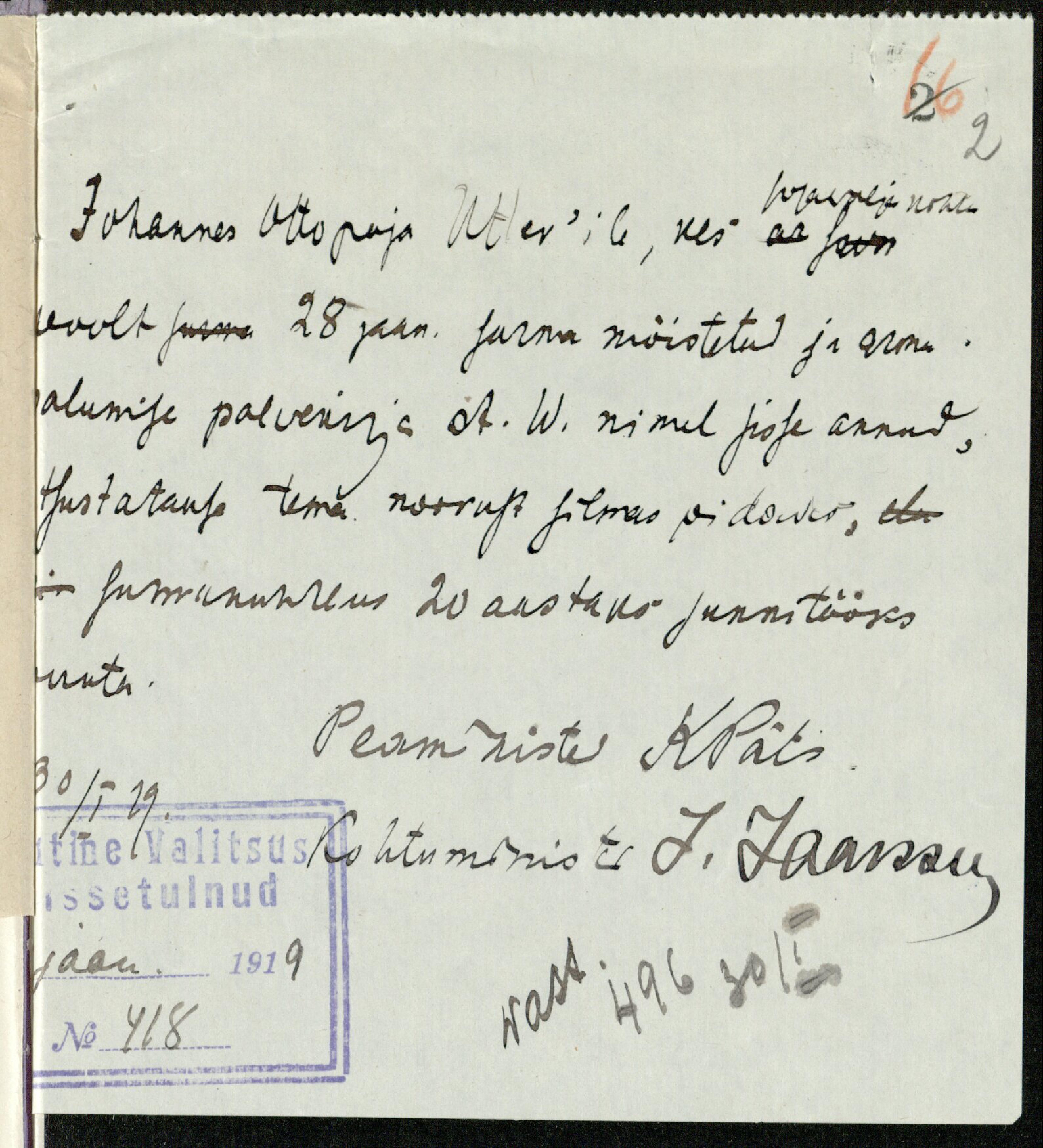 Записка о помиловании Иогана Уттера, за подписями К. Пятса и Ю. Яксона (29.01.1919)