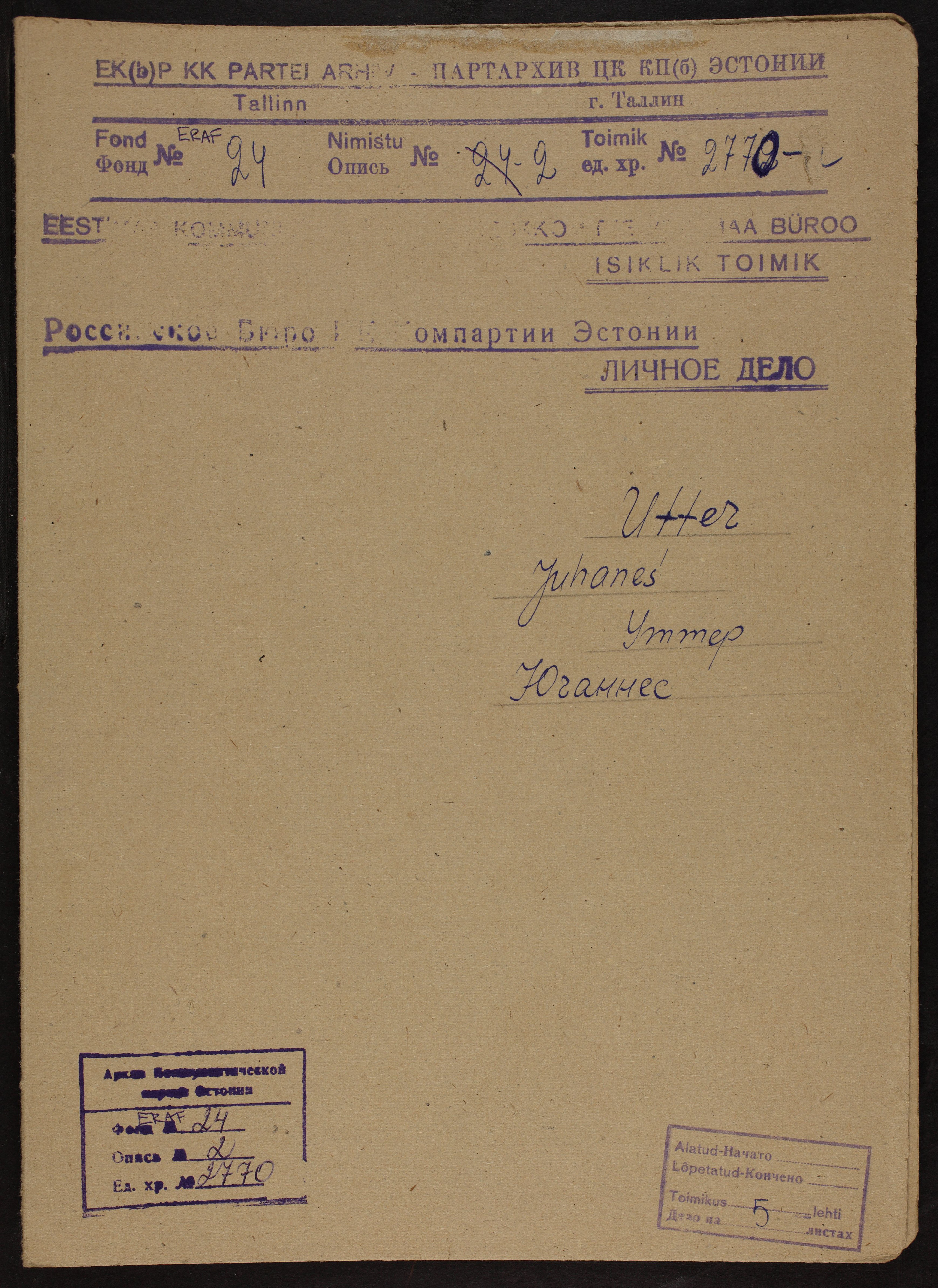 Обложка личного дела Иогана (Юганнеса) Уттера, Российское Бюро ЦК Компартии Эстонии