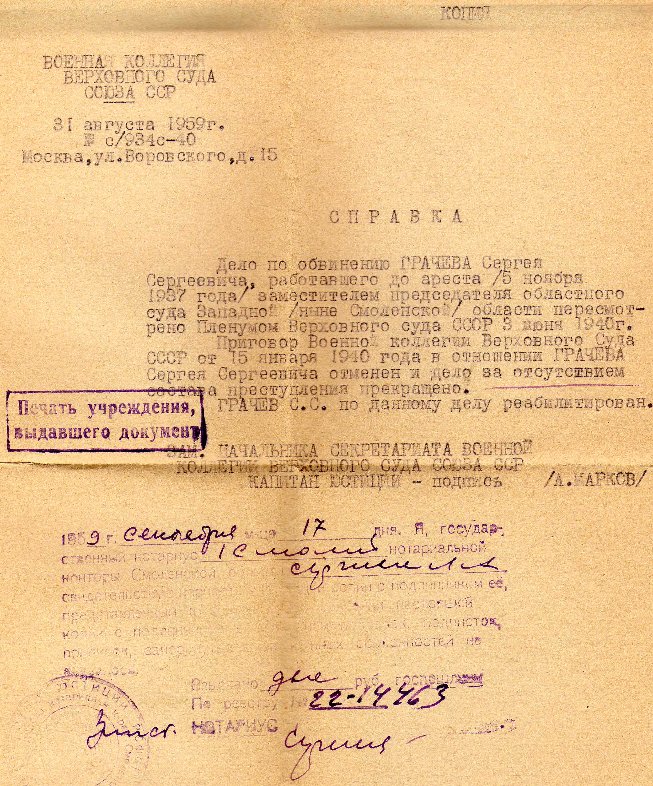 Справка ВК ВС СССР от31.08.1959