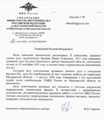 Ответ УМВД России по Магаданской области на запрос о Баулине Иване Егоровиче 1913 г.р.