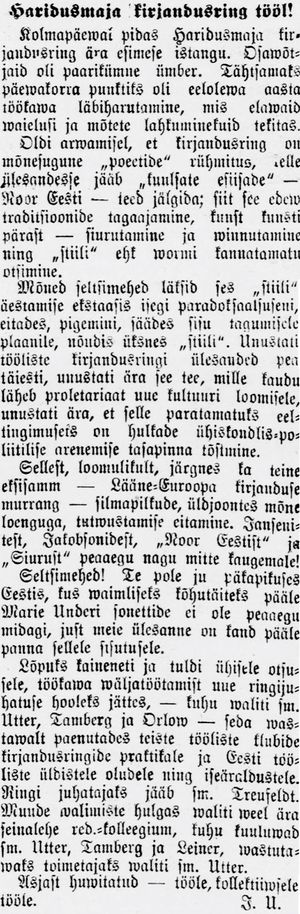 В среду состоялось первое заседание Литературного кружка Дома просвещения. В нём приняли участие около двух десятков человек. Важнейшим пунктом повестки дня стал детальный анализ прошедшего года, вызвавший оживлённые дискуссии и разделение мнений. Бытовало мнение, что литературный кружок — это своего рода «поэтическое объединение», задача которого — продолжение пути «знаменитых предшественников» вроде «Молодой Эстонии»; отсюда погоня за гонораром, разрушительная традиция искусства ради искусства, написание и вдохновение, нетерпеливый поиск собственных стилей и форм.