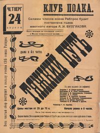 | − | [[File:Плакат пьесы А.И. Булгакова - Тяжкий путь. Размер малый..jpg| | + | [[File:Плакат пьесы А.И. Булгакова - Тяжкий путь. Размер малый..jpg|200px|thumb|left|Плакат пьесы А.И. Булгакова - Тяжкий путь. Плакат, скорее всего, был напечатан в 1925 году.]] |