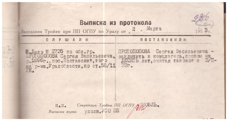 Выписка из протокола заседания Тройки при ПП ОГПУ по Уралу от 2 марта 1933 г. Протопопов Сергей Васильевич. 10 лет ИТЛ