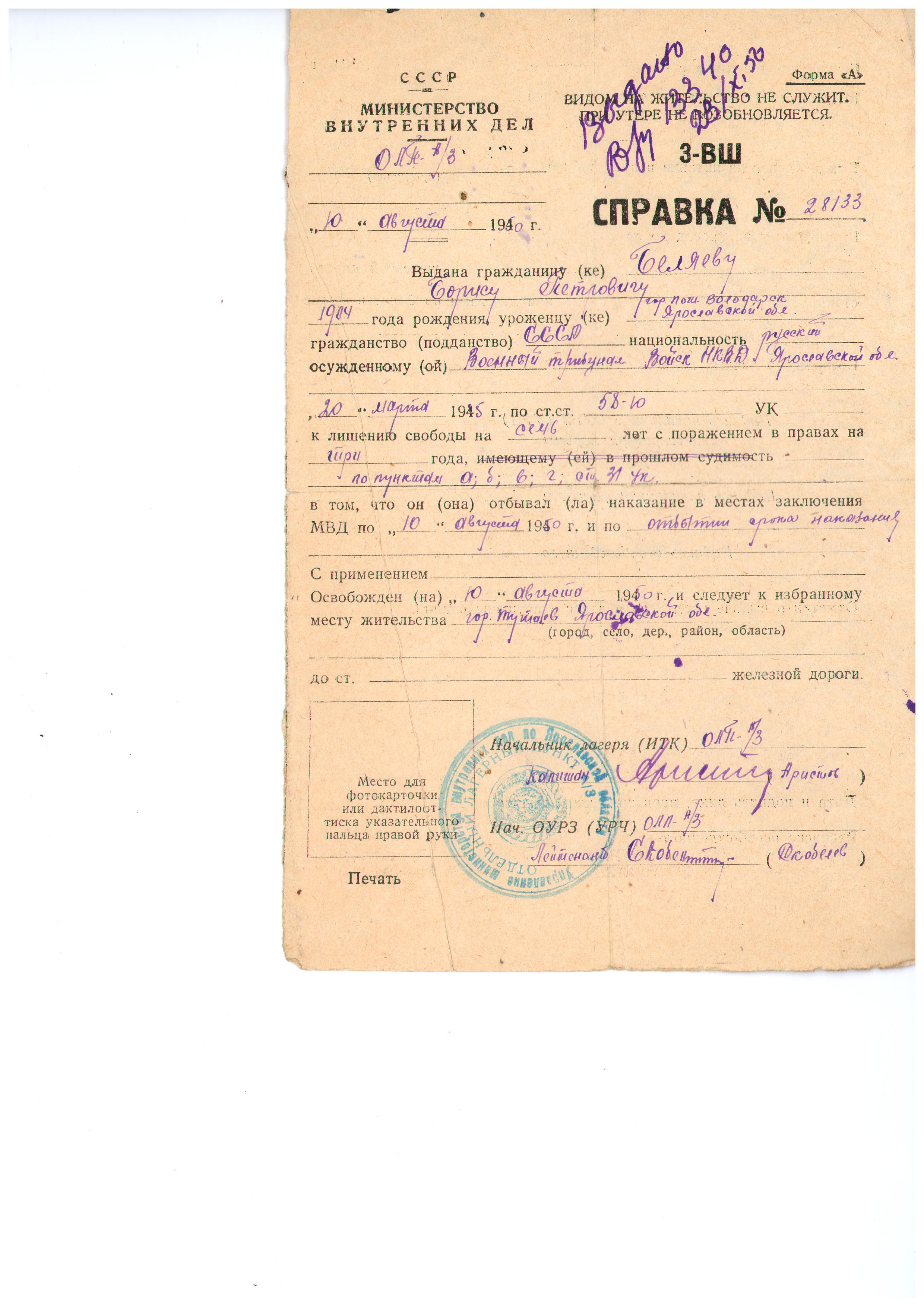 Справка № 28133 об освобождении Беляева Б. П. (по отбытии наказания) 10.08.1950 г.