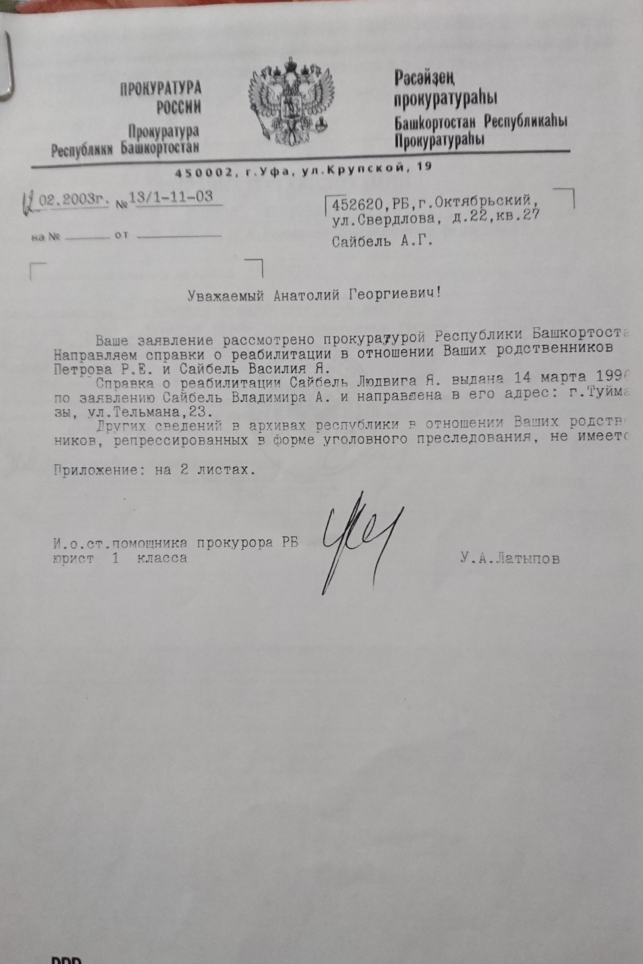 Файл:Ответ на запрос справки родственнику Сайбель АГ.JPG