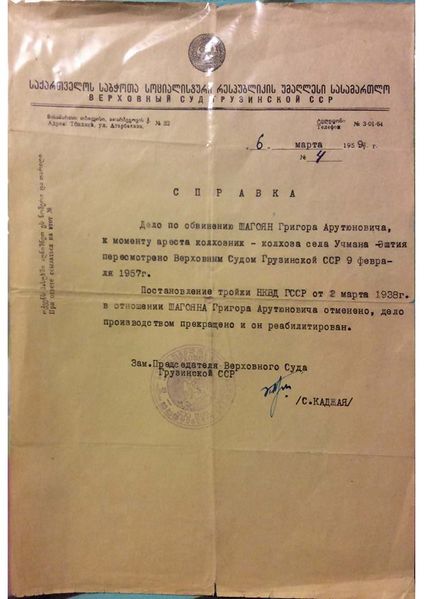 Файл:Справка о реабилитации Шагояна Григора.jpg