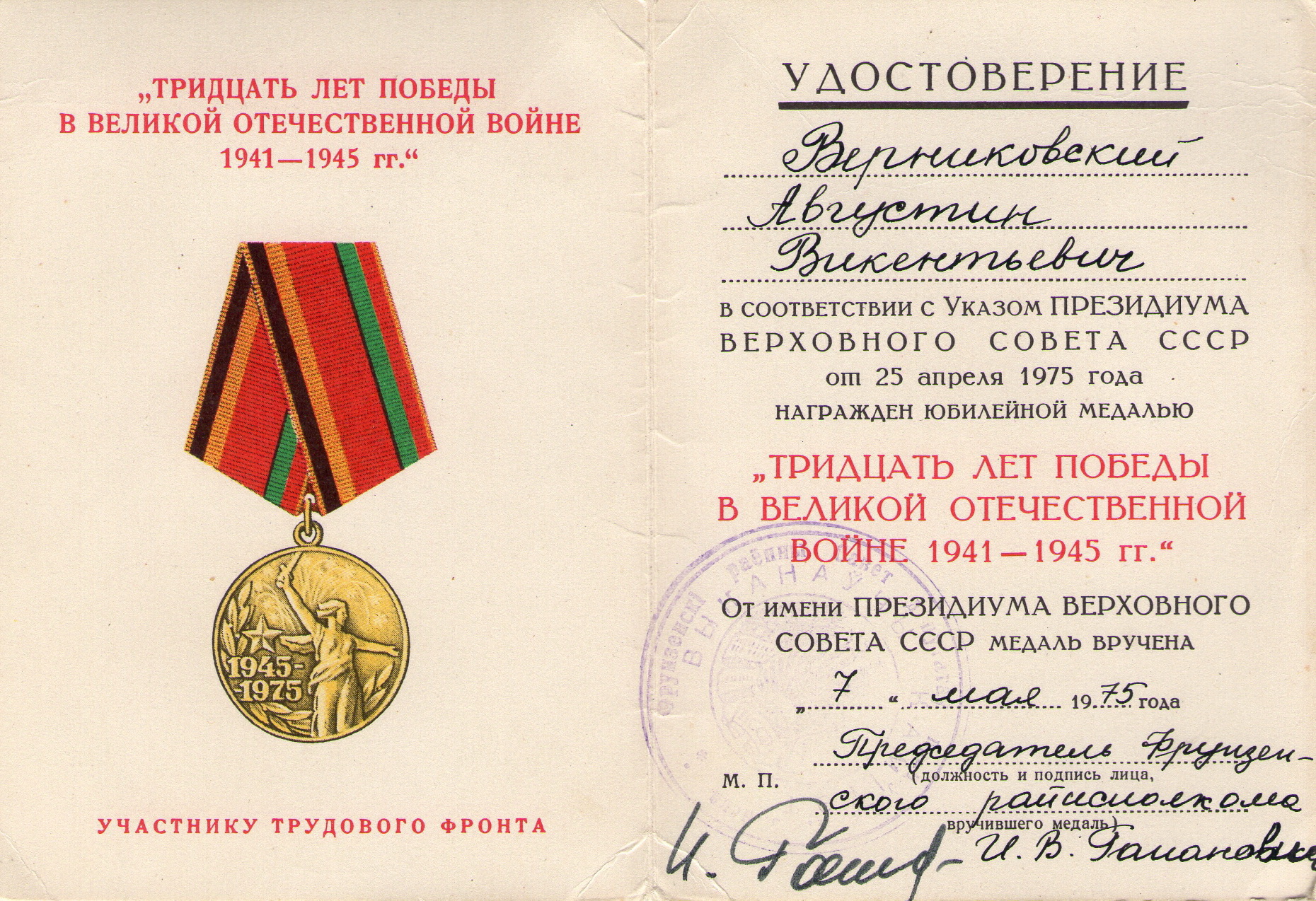 Файл:Медаль 30 лет победы Верниковский А.В..jpg