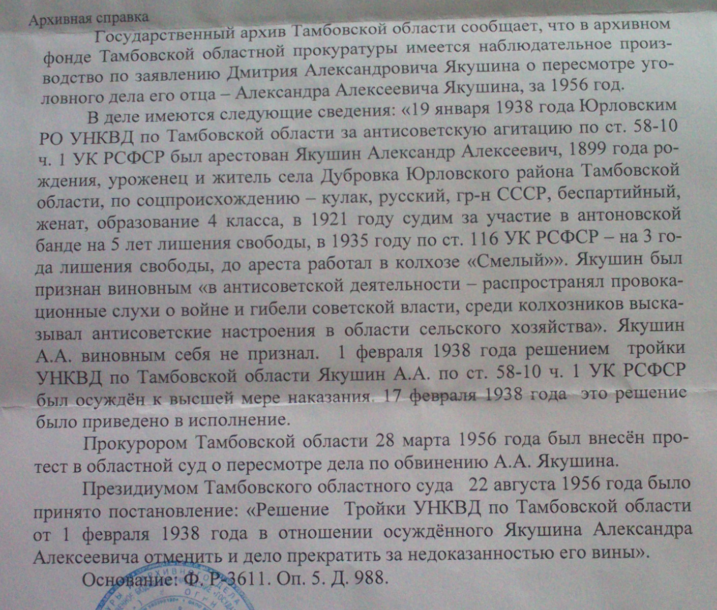 Информация, предоставленная государственным архивом Тамбовской области