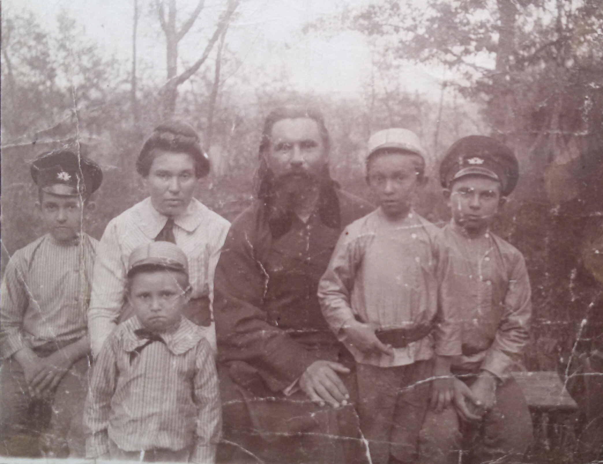Протоиерей Константин Петрович с супругой - матушкой Марией Павловной и с детьми: Алексеем, Анатолием, Сергеем и Серафимом (перечислены по старшенству, позже родился пятый сын Клавдий). Воронежская область, Бутурлиновский район, село Пузево. Дата кадра 1915 или 1916 год.