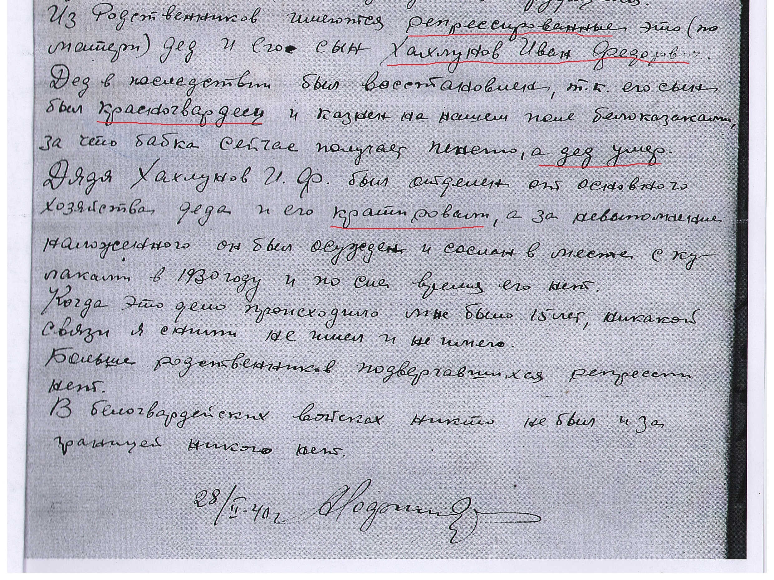 В отрывке автобиографии Андрея Митрофановича Лофицкого, племянника И.Ф. Хохлунова сообщается о репрессированном родственнике и обстоятельствах УД.