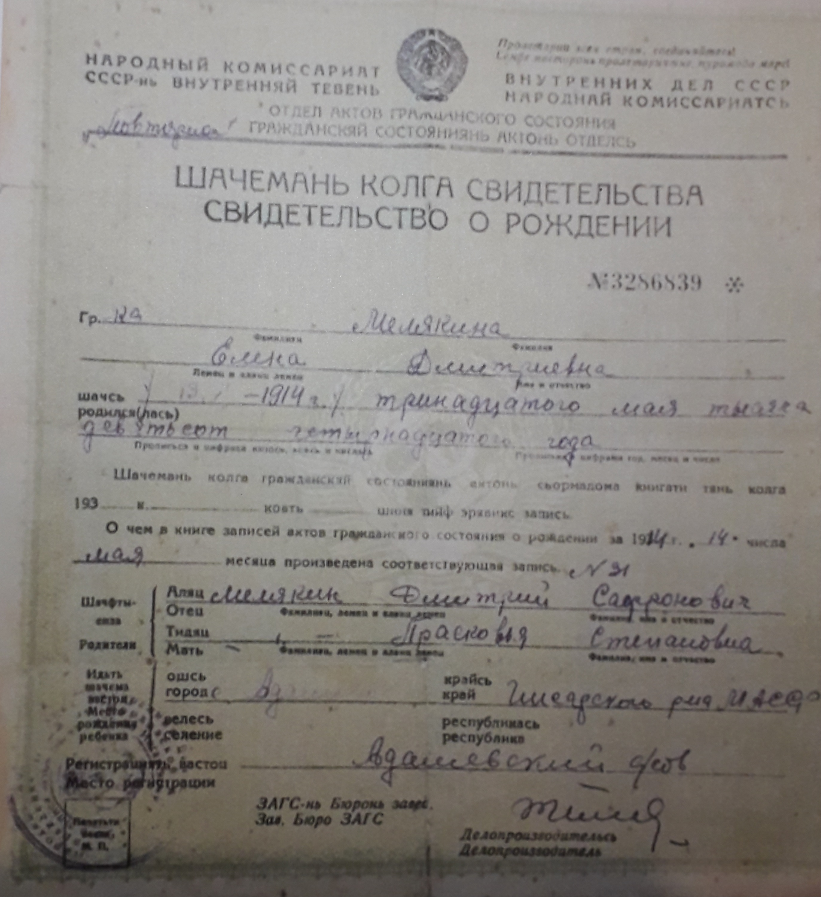 Файл:Свидетельство о рождении Мелякиной Елены.jpg