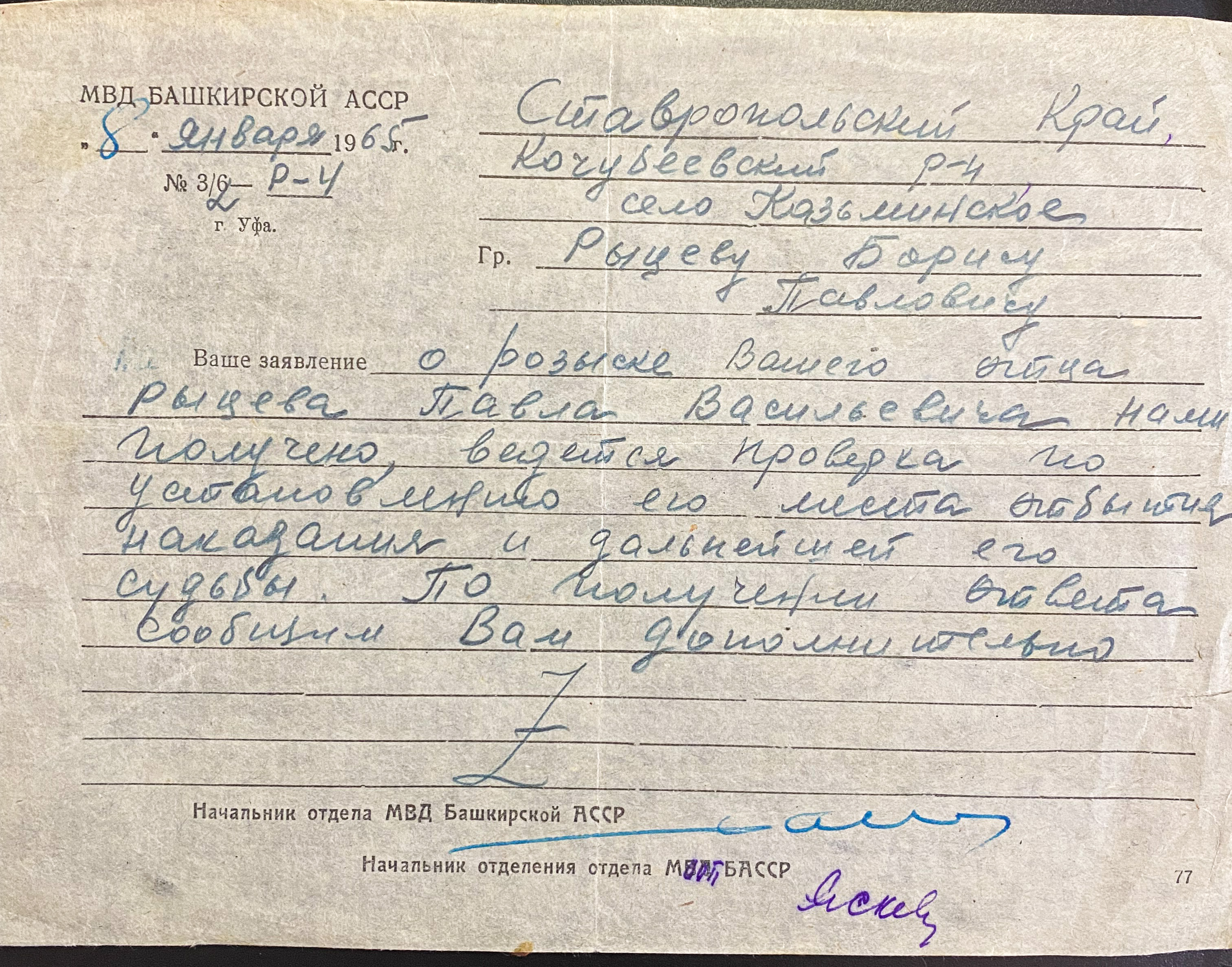 Ответ Борису Павловичу Рыцеву на запрос о розыске отца Павла Васильевича от МВД Башкирской АССР, что местонахождение отца не установлено. 08 января 1965 год