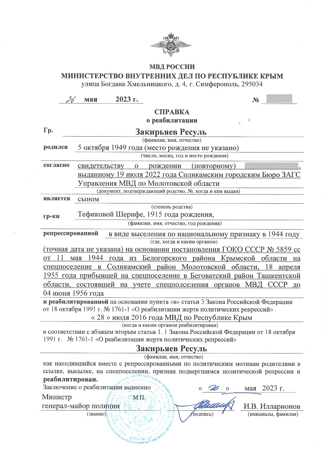 Справка о реабилитации Закирьяев Ресуль(1949)