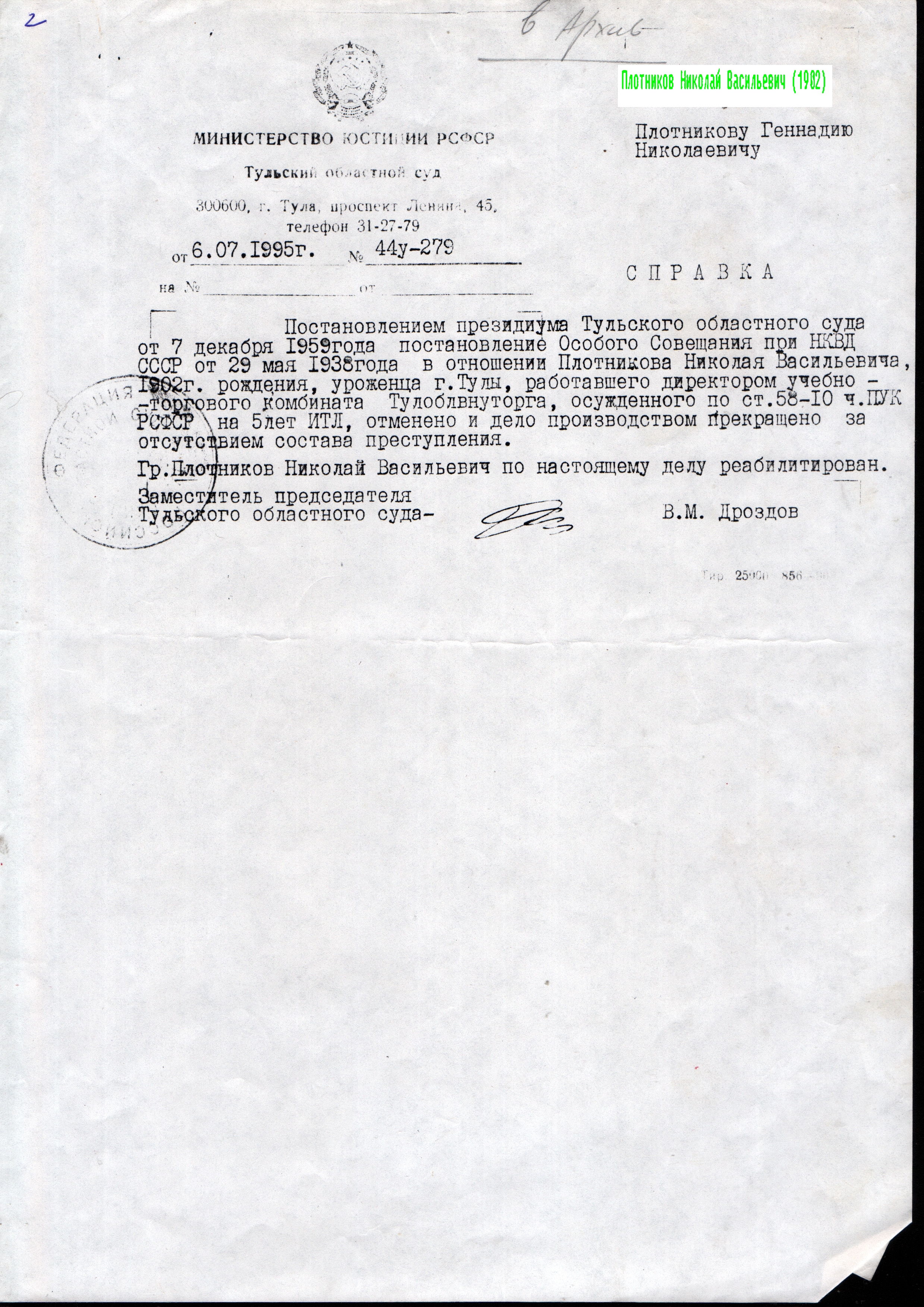 Файл:Справка Плотников Николай Васильевич (1902).jpg