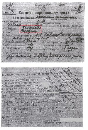 Я Зекеряев Тефук 1896 г.р. Крымская обл. Белогорский р-н дер Кишлав. Из семьи крестьян. Отец Абибулаев Зекеря, мать Зекеряева Асене. Работали до революции. Работали на своих маленьких хозяйствах. В 1929г вступили в колхоз. Работали до 1941г. С 1941г по 1944г оккупировали наши территории немцы. Во время оккупации не работали по старосте. После выслали в Ташкент и там-же померли в 1946г отец и мать. Я до революции работал в сельском хозяйстве. В 1929 г поступил в колхоз и до 1941г работал в колхозе чабаном. С 1941г по 1944г оккупировали наши территории немцы. Во время оккупации, работал по своей специальности чабаном. Когда Крым освободила Красная Армия, меня мобилизовали в Труд Армию Тульской обл. гор. Болохово шахта №27. В которой я проработал с 1944 по 1947г. В 1947г меня освободили с шахты по инвалидности. В 1948г меня прислали к своей семье Молотовская обл. гор. Боровск где я по настоящее время работаю на Бумкомбинате в лесном отделе в качестве разнорабочего. Проживаю по адресу гор. Боровск, ул. II район, барак 3-3. За границе не был и родственников не имею. Подданство СССР.